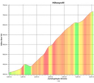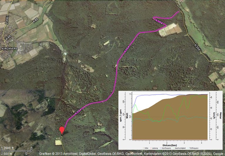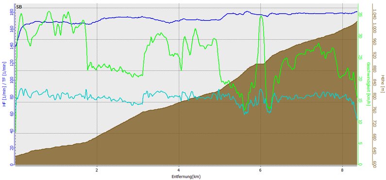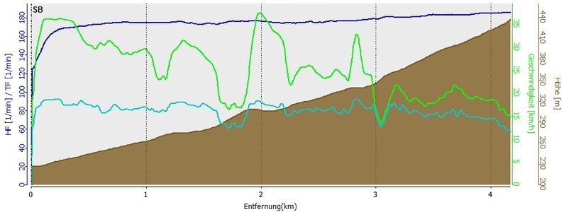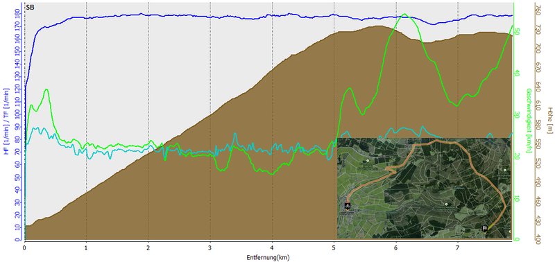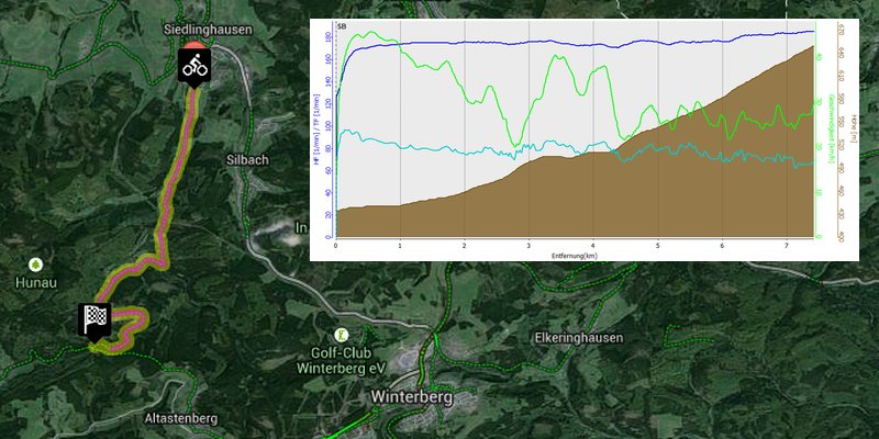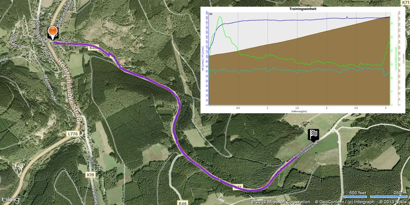 |  3km & 300HM Streckenverlauf mit Höhenprofil mit Start in Ramsbeck, entlang der K46 und K71 mit Puls am oberen Limit (blaue Kurve), stetig langsamer werdend (grüne Kurve) hinauf zur Ortschaft Wasserfall.