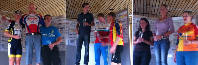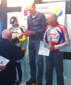| Ich hatte dann um 14:52 meinen Start, genau 1 min hinter Armin Fischer. Es wurde allerdings in 30sec Abständen gestartet, dazwischen war demnach noch mit Julian Guntermann ein jüngerer Elitefahrer eingereiht. Wie immer darf man die kurze Strecke nicht unterschätzen. Hier gilt es relativ schnell einen guten Rhythmus zu finden, den man möglichst lange halten kann. Natürlich fällt es einem am Saisonende und bei den kalten Temperaturen nicht leicht das Tempo zu halten und tendenziell wird es schon über den Streckenverlauf immer langsamer. Aber ich kam besser zurecht als die verpatze Generalprobe vermuten ließ und konnte den vor mir gestarteten Fahrer bereits zur Rennhälfte überholen. Auf Armin hatte ich auch einiges an Zeit gutmachen können, konnte ich ihn doch schon relativ früh vor mir herfahren sehen. Ab dem zweiten Kilometer bin ich sonst immer etwas aus dem Rhythmus gekommen, doch diesmal bin ich mit ca. 15km/h mit 39/23 sitzend weitergefahren. Das ging erstaunlich gut noch bis ca. 100m vor dem Zielstrich. Ab dort wird es etwas flacher, schnell noch die letzten Kräfte mobilisiert (viel war es ja nicht mehr) und nochmal im Sprint alles gegeben. Im Ziel waren es dann 10:45 für mich - nicht überragend, aber besser als ich gedacht hatte. Für Armin lief es in 11:10 etwas schlechter als im Vorjahr. Sven Gemeine hatte ich bis hierhin überhaupt noch nicht gesehen, auch nicht beim Warmfahren auf der Strecke. Eine Zeit um 10:40 liegt für ihn in Bereich des Möglichen, was Sven in den vergangen Jahren auch immer wieder untermauern konnte. Ich mußte mich bis zur Siegerehrung gedulden, um schließlich zu erfahren, daß Sven Gemeine so gemein war, lediglich eine Sekunde schneller zu fahren als ich. Bisher hatte ich zumeist bei knappen Entscheidungen Fortuna auf meiner Seite gehabt, doch diesmal (leider) nicht. Ist im Nachhinein müßig darüber zu grübeln, wo man die eine Sekunde gelassen hatte. Das sind ja nur ein paar Meter, wenn überhaupt dachte ich zuerst. Doch um ganz genau zu sein, sind das bei meiner Geschwindigkeit beim überqueren der Ziellinie von ca. 23km/h, genau 6,4m. Nehme ich meine Durchschnittsgeschwindigkeit von 17.2km/h als Berechnungsgrundlage, so sind es hier nur 4.8m. Aber was soll's. Vielleicht hätte ich früher in den Wiegetritt gehen und/oder mehr auf der Idealline fahren sollen - hätte/wäre/könnte/sollte, ist am Ende alles egal.