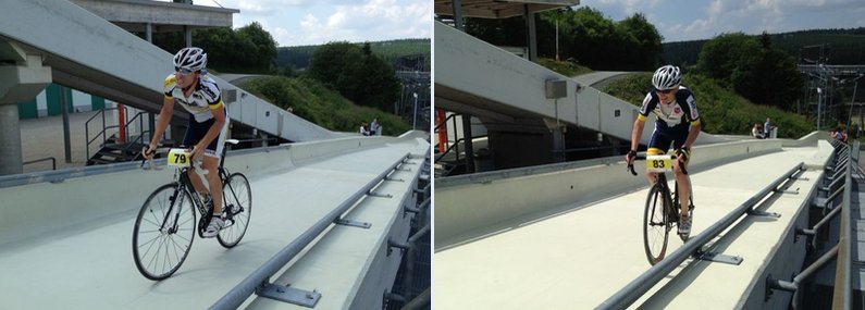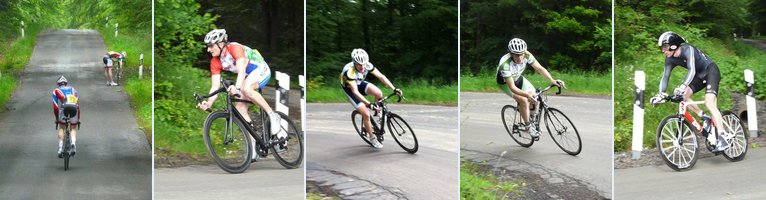 | Nun ist sie schon wieder fast vorbei, die Radsportsaison 2013. Etwas müde zum Saisonabschluß, wenig Training in den letzten 2 Wochen und durch einige Festivitäten in der Zwischenzeit habe ich rund 1,5kg mehr auf den Rippen. Doch die 3km und mit relativ konstant 10% ansteigender Strecke mit Start in Ramsbeck liegt mir irgendwie. In den vergangen Jahren konnte ich daher hier immer wieder mal gewinnen. Lediglich Ingo Koßmann vom Team cycle-basar konnte mir bisher in meiner AK gefährlich werden. Seine 10:04 aus dem Jahr 2008 ist bisher ungeschlagen bei den Senioren. Meine Bestzeit aus 2011 liegt übrigens bei 10:26 - ist ja auch nicht sooo schlecht. Doch leider hat Ingo auch in diesem Jahr nicht gemeldet. Umso erfreulicher fand ich die Tatsache, einem Teamkollege von Ingo über den Weg zu laufen, den ich gleich befragt hatte: Ingo wollte kommen, doch mußte er leider krankheitsbedingt passen. Hmmm, schade und auf diesem Wege gute Besserung! Also Ingo, für die kommende Saison sattel die Hühner und zeige dich wieder - du wirst hier echt vermißt!! Doch nun weiter im Programm: Mit Armin Fischer vom RSC Monte Kali Neuhof (frisch gebackener Hessenmeister im EZF 2013) und Sven Gemeine hatten auch gleich wieder die üblichen Kollegen mit Siegambitionen gemeldet. Torsten Kren von der RSG Buchenau hatte seinen Fokus in diesem Jahr etwas mehr auf das Laufen verlagert, ich hatte ihn deshalb diesmal nicht auf der Rechnung. Während Armin ganz selbstkritisch mit den ganz steilen Zeitfahren so seine Probleme hat, ist dies für Sven eher umgekehrt. Obgleich sehr groß und kein wirkliches Leichtgewicht, konnte er sich in den letzten Jahren auf dieser anspruchsvollen Strecke immer auf dem Podium behaupten. In diesem Jahr hatte er sichtbar abgenommen und sah recht austrainiert aus. Bereits beim BZF in Betzdorf waren wir nahezu zeitgleich, man(n) durfte also diesmal um den AK Sieg mal wieder gespannt sein.