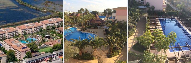 | Die Bilderserie ist aus dem Vorjahr und zeigt die Hotelanlage des Viva Blue an der Platja de Muro aus der Vogelperspektive. In diesem Jahr hatten Armin und ich ein Zimmer mit Blickrichtung auf das Naturschutzgebiet s'Albufera (linkes Foto, oberer Bildrand)