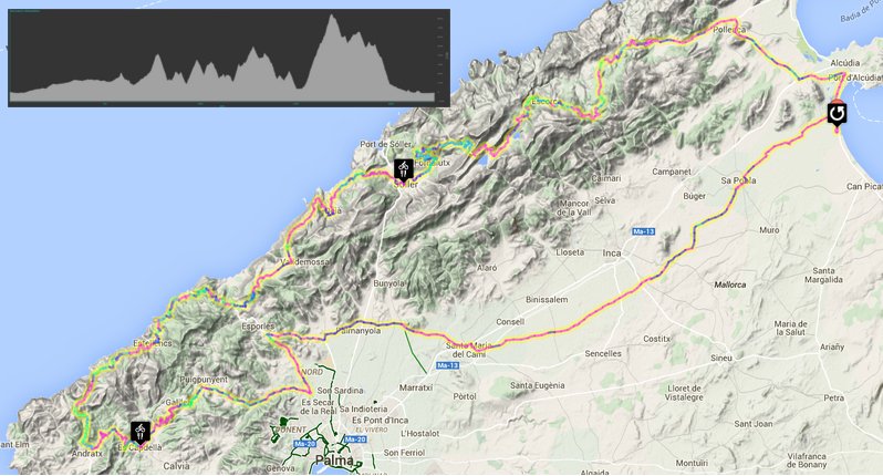 | Dargestellt ist der sog. Küstenklassiker in der "Extended Version" mit Start in Alcúdia, flachwellig über Santa Maria nach Esporles fahrend, um dann am Kreisel in Andratx den eigentlichen Küstenklassiker unter die Räder zu nehmen. Die Strecke hat Armin Fischer ausgetüftelt und wird von ihm mindestens 1x pro Jahr absolviert. In diesem Jahr haben Thomas und ich Armin erstmalig auf der ca. 225km langen Strecke mit rund 3.300 HM begleitet. René war am Vortag zum zweiten mal Sa Calobra gefahren und benötigte einen Ruhetag.