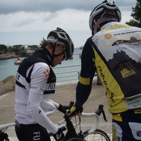 | Am 2. Tag sind wir wie auch im Vorjahr alle gemeinsam zunächst in Richtung Artà zum Ermita de Betlem gestartet. Danach ging es Richtung Süden nach Porto Cristo, wo wir direkt am Hafen einen Café con Leche Stop eingelegt hatten. Über Felanitx an San Salvador vorbei (ohne hochzufahren) ging es dann über Petra, San Joan, Sineu und Sa Pobla zurück ins Hotel. In Summe ca. 160km, bei strammen 1.541HM in ca. 5:30’h. Janine hat sich mehr als wacker geschlagen und man sah ihren Trainingsfleiß über den Winter. Wir mußten nirgends groß warten und sie konnte alles mitfahren - Respekt! Am 3. Tag habe ich mir morgens kurz vor der Abfahrt das rechte Knie verdreht: Im Hotelzimmer in meinen Schlappen weggerutscht. Das sorgte für relativ starke Schmerzen bei der Ausfahrt, die den Randa im Programm hatte. Der erste größere Anstieg im Trainingsprogramm. Ich habe mich dann an den folgenden Tagen aus der "Speedgruppe" verabschiedet und bin mit Larry und Volker gefahren, die aus den genannten Gründen deutlich langsamer unterwegs waren - die ideale Gruppe für mich, um mein angeschlagenes Knie nicht zu überlasten. Wir drei hatten in den folgenden Tagen viel Spaß und sind bei prima Wetter so zwischen 100 und 130km Touren bei eher geringer Intensität gefahren. Foto rechts: Janine & ich in Porto Cristo, kurzer Check am Radcomputer, dann Café con Leche am Hafen.