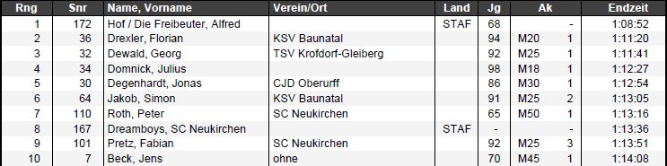 | Aber auch der Rest von uns hat sich recht wacker geschlagen: Allen voran Janine, die in der Damenwertung in 1:00:55.4 den 2. Platz erreichen konnte. Für mich keine wirkliche Überraschung. Jörg hat sich wohl etwas zurückgehalten und konnte in 53:50.7 in seiner AK den 5. Platz erkämpfen, doch seine Zeit sollte noch kommen, um es gleich vorwegzunehmen. Für Thomas lief es gar nicht gut und er mußte krankheitsbedingt bei Rennhälfte aufgeben. Eine weise Entscheidung wie ich meine, die man respektieren muss ... die Gesundheit geht immer vor, immer! |