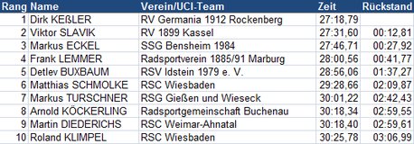 | Am Vortag sind wir also - mit wir meine ich natütlich unsere kleine Renngemeinschaft - nochmal locker um den Ossiacher See gefahren, so daß ich ausgeruht zum Einzelzeitfahren am Start stand. Und es lief richtig gut für mich. Hatte mir extra aus dem Vorjahr noch einige Wegpunkte gesetzt, um meine Zwischenzeiten vergleichen zu können. Lag ich am ersten Wegpunkt (die 1. Ampel in Villach) noch nahezu gleichauf mit meiner Vorjahreszeit, konnte ich bis zur zweiten Zwischenzeit (dem Abzweig zurück nach Ossiach) schon rund 1 min gutmachen. Danach folgte der kurze Anstieg bis zum Ortseingang Feldkirchen und ich lag bereits 1,5 min unter meiner alten Marke. Auf dem letzten Teilstück habe ich nicht abgebaut und meinen Rhythmus durchgezogen. Belohnt wurde ich mit einem 3. Platz in der Altersklasse in 54:46,2. Damit war ich lediglich 1,3sec langsamer als der Zweitplazierte Torsten Kunath vom Jenatec-Biehler Masterteam. Aber nach hinten war es auch noch recht eng: Lokalmatador Gebhard Pertl (RC ABRÖ Raiffeisen Feld am See) folgte knapp in 54:59,2. Gewonnen hat meine AK ganz souverän Maik Beer (Büstner Cycling Team) in 53:44,0. Maik kannte ich schon aus dem Vorjahr und war mein Favorit auf den AK Gesamtsieg. Aber auch Torsten Kunath war kein Unbekannter. Armin hatte mich bereits vorgewarnt, daß der Bursche ein sehr kompletter Fahrer sei und auch sehr gut mit der Zeitfahrmaschine umzugehen wisse. Er sollte recht behalten. |