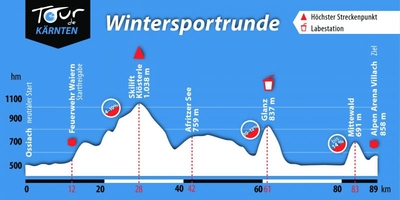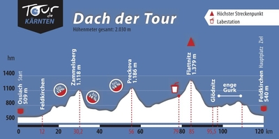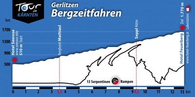 | Denn auch dieses mal stand das 40km Einzelzeitfahren rund um den Ossiacher See wieder auf dem Programm. Auch sonst fanden sich auf den sechs Etappen einige Elemente und Besonderheiten wieder. Allen voran die legendäre Bergankunft an der Jausenstation Buggl in Bach. Insgesamt galt es rund 480km und ca. 8.200HM im Renntempo zu absolvieren. Im Vergleich zum Vorjahr etwas anspruchsvoller, mit steileren Rampen mit bis 18% Steigung. Zum Abschluss folgte ein sehr schweres Bergzeitfahren hinauf auf die Gerlitzen mit 13km, 13 Kehren und ca. 1.300HM. |