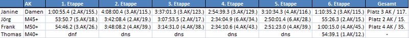 | Die Übersicht zeigt die Tagesergebnisse mit der jeweiligen Platzierung in der Altersklasse (AK). Janine stand bis auf die Bad Bleiberg Etappe immer auf dem Treppchen, Jörg glänzte 3x mit Platz 2 wenn es richtig steil wurde. Thomas zeigte gewohnte (Berg-)Zeitfahrqualitäten am letzten Tag und ich hätte nie damit gerechnet, ausgerechnet beim (bisher) ungeliebten Einzelzeitfahren meine beste Performance abzuliefern ... ist schon ein wenig verrückt.